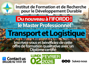 L’Institut de Formation et de Recherche pour le Développement Durable (IFORDD) ne cesse d’innover dans ses offres de formation aux apprenants. C’est dans cette optique qu’il annonce le lancement, le 02 février 2026, du Master professionnel en Transport et Logistique pour le compte de la nouvelle année académique 2025-2026.